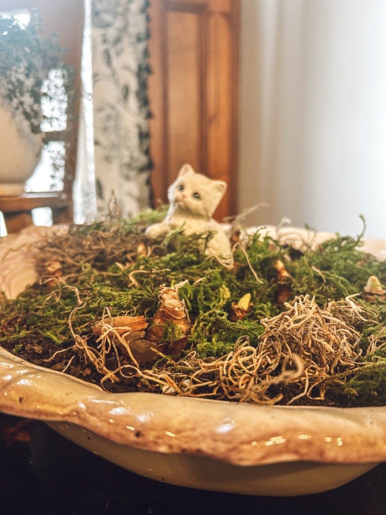 Enjoyed making this adorable garden for my daffodils. I got the large bowl from the thrift and the cute little kitty….this will make it feel like spring when it gets so cold because we will have another cold snap that I assure you!