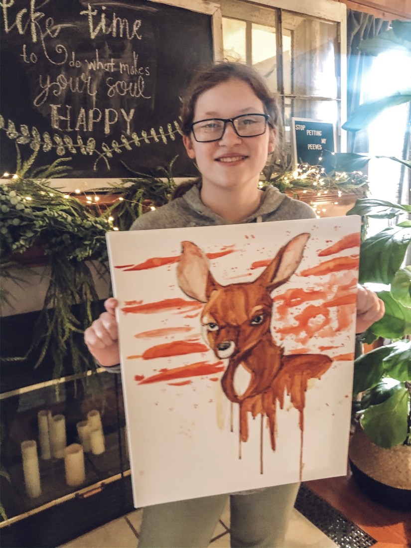 I cried after my daughter got off face time with her violin teacher…when she cried about missing skating with her friends and ice skating and field trips and friends coming over to hang out…so I’ve distracted her the best way I know how…and bought her art supplies and started her on an online class which she of course finished WAY before she should…and now…the kid has a side business going….and she’s making the walls of my house look way cooler.